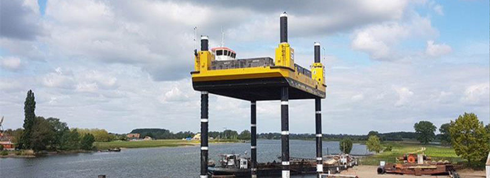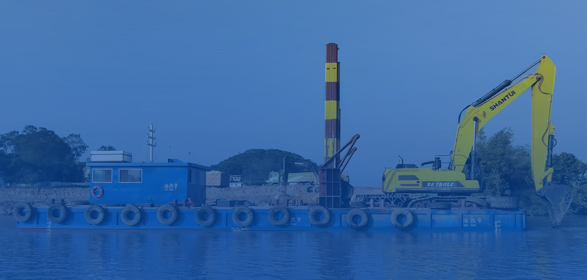 2、施工平臺穩性強,方便挖掘機在深水區施工作業。并且,平臺自帶航行動力,便于水上調遣。
